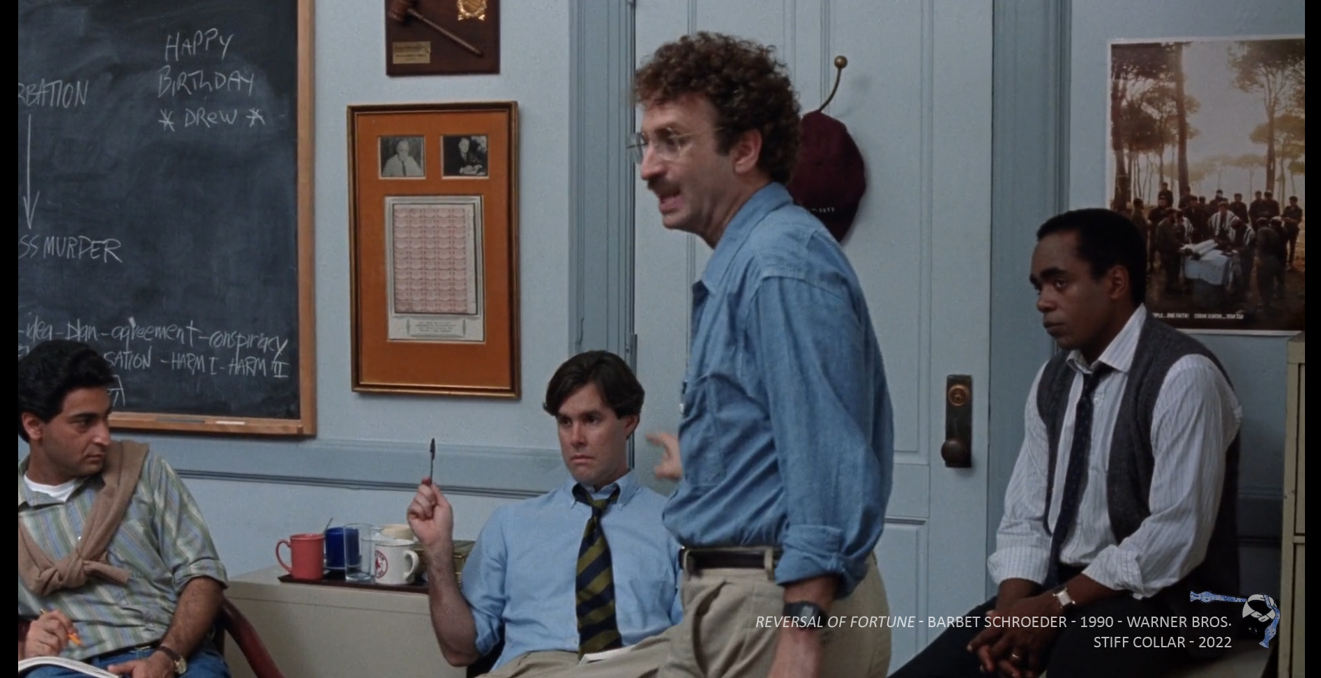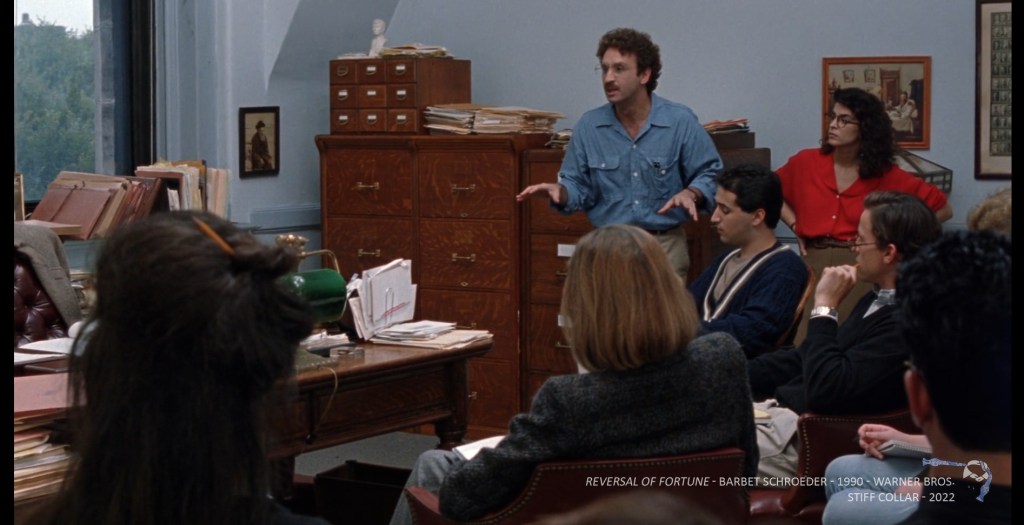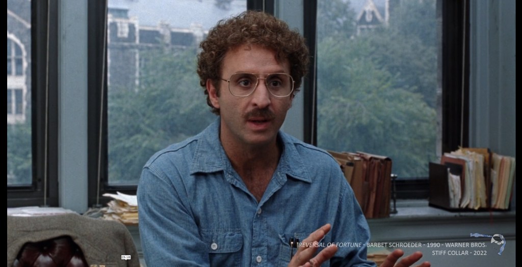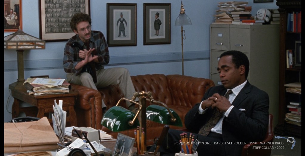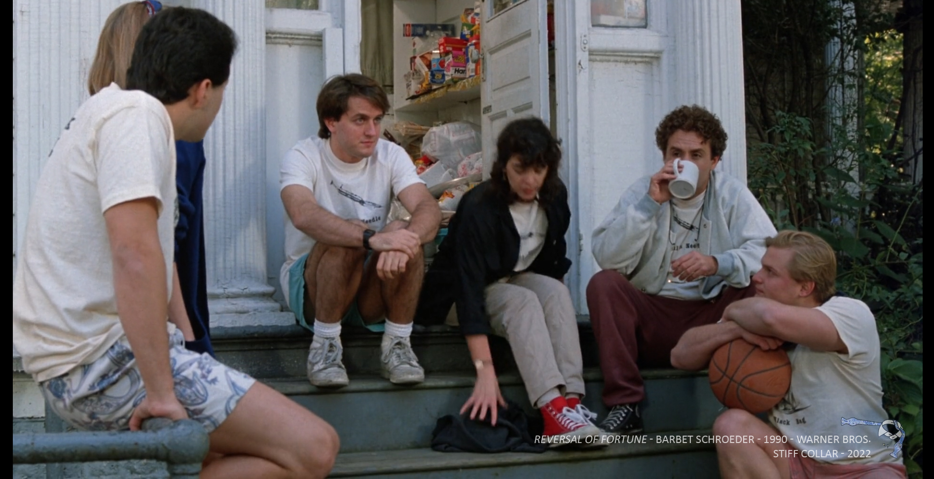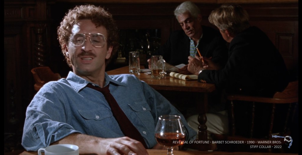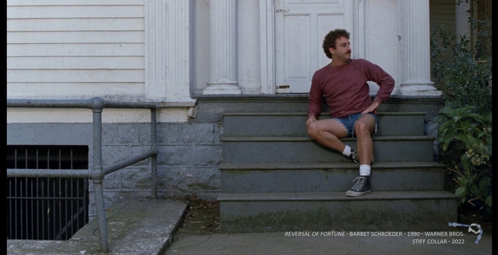 Passons maintenant à l’acteur Ron Silver interprétant l’avocat Alan Dershowitz, qui est l’auteur du livre dont est tiré le film, et qui fut l’avocat de Claus von Bülow. Une vestiaire encore une fois très preppy. Dershowitz avant d’être un avocat, ou en même temps, est professeur de droit à Harvard. Les choix vestimentaires sont donc orientés pour distiller cette impression universitaire. Il n’est pas collé monté. Sa première apparition l’indique immédiatement, sweat, jean coupé et Converse montantes. Un lettré humaniste ET joueur de basket, l’idéal Ivy League.