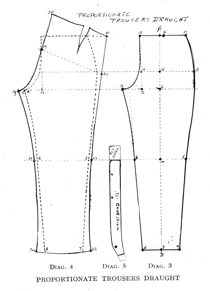 Elle permet de diminuer le volume du pantalon, qui est obligatoirement plus large au bassin qu’à la taille. Normalement, la plupart des pantalons disposent d’une petite pince au dessus de chaque poche. Elles aident à gérer le volume du fessier et à faire en sorte que le pantalon « emboite » le porteur, comme on dit. Sur ce vieux patronage, remarquez l’encoche profonde en haut du panneau du dos, en forme de coin, dont la « soudure » permet de serrer la taille :