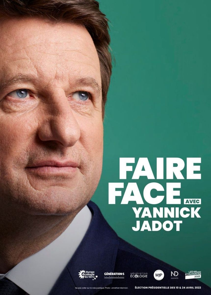 Restons à gauche une dernière fois. Yannick Jadot n’a jamais l’air d’un écolo. Cheveux bien peignés, chaussures qui ne montrent pas les doigts de pieds et cravates. Souvent la cravate, et le col roulé parfois. Et comme Monsieur Roussel, il y a un peu de variété dans ses costumes. Sur son affiche, on voit très peu de chose. Mais suffisantes pour juger que l’étoffe est de qualité, de la laine fil à fil bleue, avec une délicate surpiqure du bord du col, signe d’un bon costume. La cravate enfin, qui pointe à l’angle est une grenadine. Ça c’est bien. Chic et sobre.