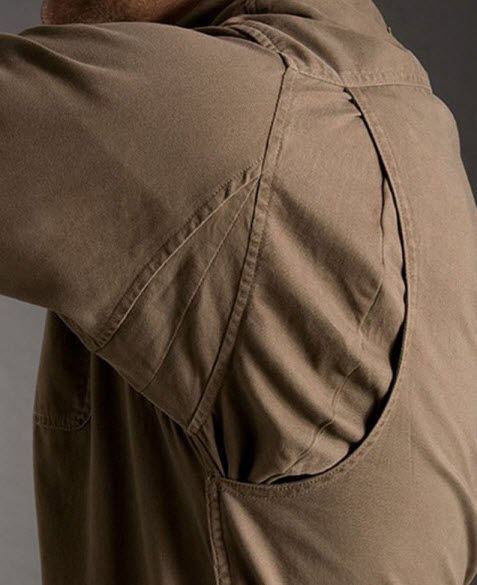 Seconde condition, que le vêtement soit impérativement généreux dans ses dimensions. Et c’est précisément le cas des deux vêtements cités. Ils sont faits pour être généreux, permettant vestes ou gros pull-overs dessous. Il faut du volume pour permettre aux soufflets de ne pas être mis beaucoup en jeu. Tout est là. Le ou les soufflets doivent servir en dernier recours, pour les gestes de vraiment grande ampleur. Dans le cadre d’un vêtement ajusté parfaitement, le soufflet se met immédiatement en jeu, et alors, il va rester ouvert tout le temps. Disgracieux.