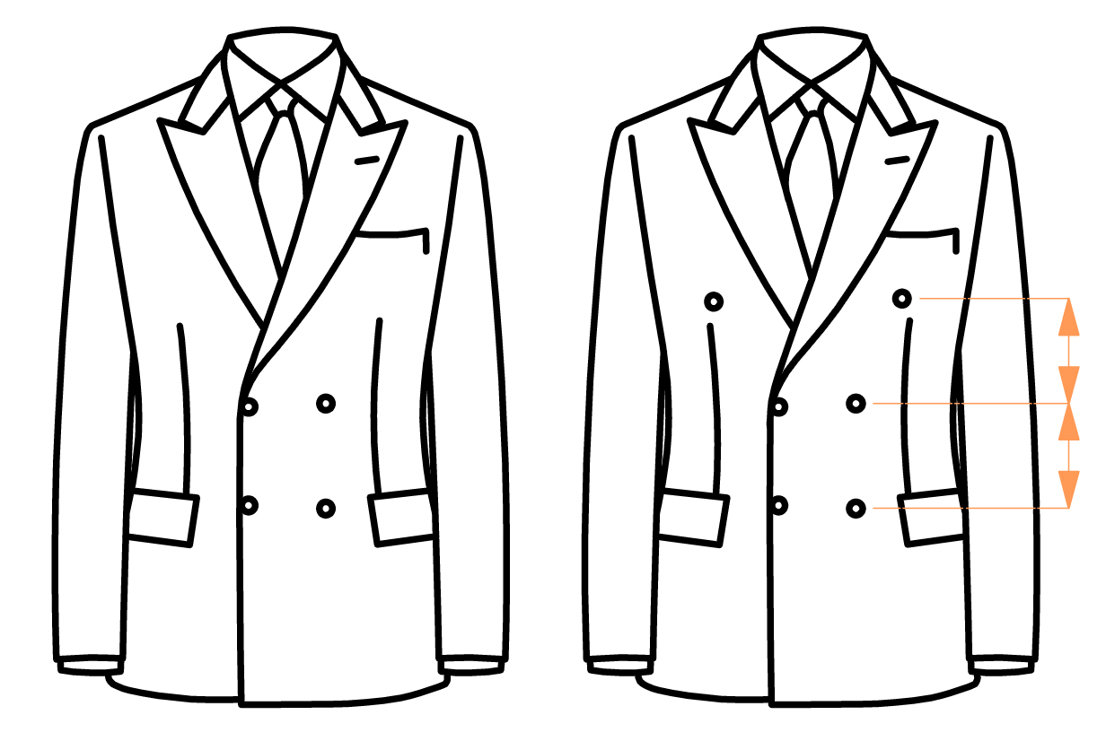Anglais et italiens n’ont je crois pas la même approche de ce positionnement. Les anglais ont tendances à placer ces boutons proches du centre, donnant un V peu marqué, ci-dessous à gauche. A l’inverse les italiens placent les boutons de manière plus excentrés ci-dessous à droite, accentuant le V. Ralph Lauren est le maître en la matière, avec des boutons de poitrine placés sur les pinces devant. Je fais ainsi presque. J’aime bien. C’est selon les goûts.