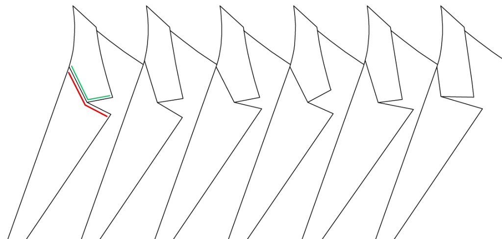 Dans le cran pointu, une autre forme traditionnelle issue de l’École anglaise, la ligne d’anglaise se brise en deux. Elle est d’abord descendante, puis montante. Et le col épouse cette anglaise. Par couture d’abord, par simple jonction ensuite. Voyez ces schémas :