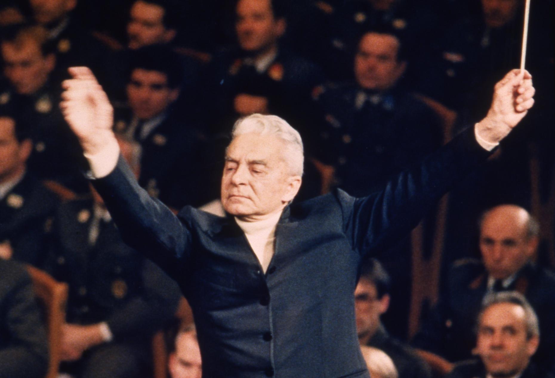1987. Herbert von Karajan. Il portait une veste (courte, non une jaquette) à cinq ou six boutons, à col cheminée fuyant. Et un nœud papillon façon 1880, placé sous le col de chemise et serti d’un petit anneau métallique. Choix audacieux. L’orchestre jouait en costume avec cravate à carreaux.