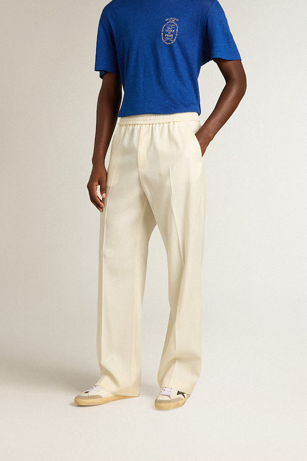 On pourrait croire alors que dans un look sartorial, le pantalon de gabardine blanc est le graal. Seulement voilà, je n’ai presque jamais trouvé un drap de laine écrue qui ne soit pas transparent. Et oui, c’est l’écueil numéro 1. Il faut le savoir. Sur un pantalon de laine écrue, on voit tout, les coutures d’abord, les fonds de poche ensuite, le caleçon enfin. Même avec des sous-vêtements blancs, on devine la peau, etc… C’est toujours très frustrant pour le tailleur qui se retrouve devant le client sans savoir quoi dire. Même la gabardine Loro Piana de 340grs est ultra transparente. Cela se remarque sur le pantalon ci-dessous, vendu 585,00 $ chez Golden Goose, et dont la photo a du être particulièrement retouchée.