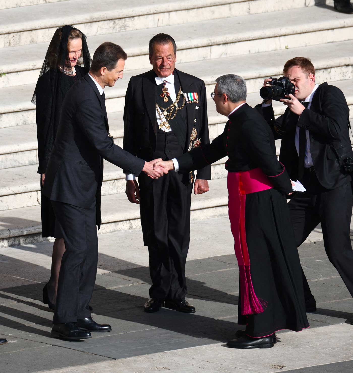 Le prince héréditaire Alois de Liechtenstein et son épouse font aussi dans le traditionnel. Le gentilhomme du Pape à la ceinture de moire noire (le prince de Windisch-Graetz) fait un peu vieux de la vieille, il a un coffre que la queue-de-pie contient mal, elle semble bancale, mais il m’amuse beaucoup, il a de l’allure. Je m’interroge toutefois sur un décalage. Deux princes sont en présence face à l’ecclésiastique. L’un porte sa livrée (la queue-de-pie) et l’autre un simple costume. Le Vatican fait il passer une consigne demandant le costume simple? Dès lors, les gentilshommes ne font pas trop habillés? Ou les invités ne pourraient-ils pas être en jaquette noire? Remarquons le photographe en costume noir !