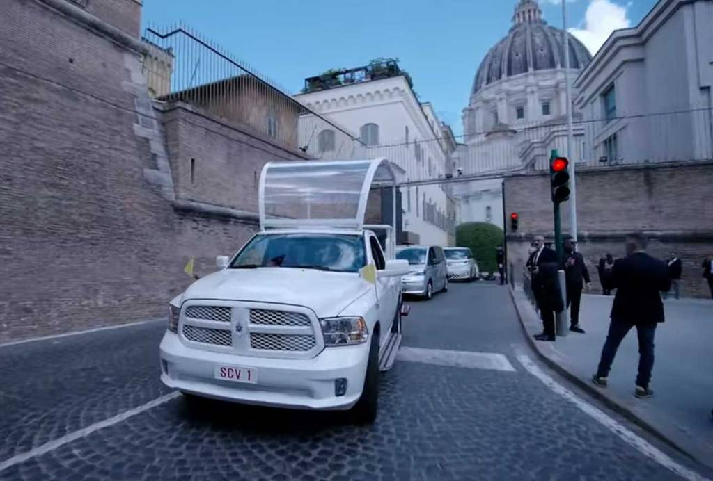 PS : il est une chose vraiment laide et qui me choque, c’est ça : un affreux pickup américain… Mais où diable sont parties les notions d’élégance et d’amour propre? Quand on met des gardes-suisse habillés en pourpoint moyenâgeux et qu’on se montre tatillon sur le métrage de dentelle dans les soutanes, on trouve quatre chevaux noirs et on ressort un vrai corbillard garni de velours. Un corbillard à moteur, ça devrait être in-ter-dit !