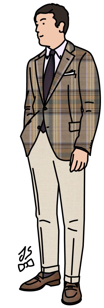 Ce type d’approche ouvre la voie à une manière contemporaine d’apprivoiser ces vestes. On conserve ainsi leur éclat et leur personnalité, tout en évitant le côté tapageur. Dans le même esprit, un pantalon de velours côtelé épais dans une teinte neutre – blanc cassé ou ivoire – permet également d’alléger l’ensemble. On reste dans un registre rustique, cohérent avec le tweed, mais sans tomber dans l’exubérance colorée. L’effet est lumineux, élégant, et donne à la veste chamarrée l’espace nécessaire pour s’exprimer sans être concurrencée. Autre possibilité, sélectionner un pantalon rappelant les tons de la veste, mais dans une palette non saturée, de couleurs douces, voir image ci-dessous. Ces choix – jean brut, velours neutre, flanelle sobre – montrent qu’il est possible de porter des vestes aux carreaux voyants sans verser dans la panoplie caricaturale. Tout l’art consiste à équilibrer l’excentricité anglaise avec une certaine retenue italienne : un dialogue entre fantaisie et mesure, qui rend le tweed chamarré non seulement regardable, mais véritablement portable.
