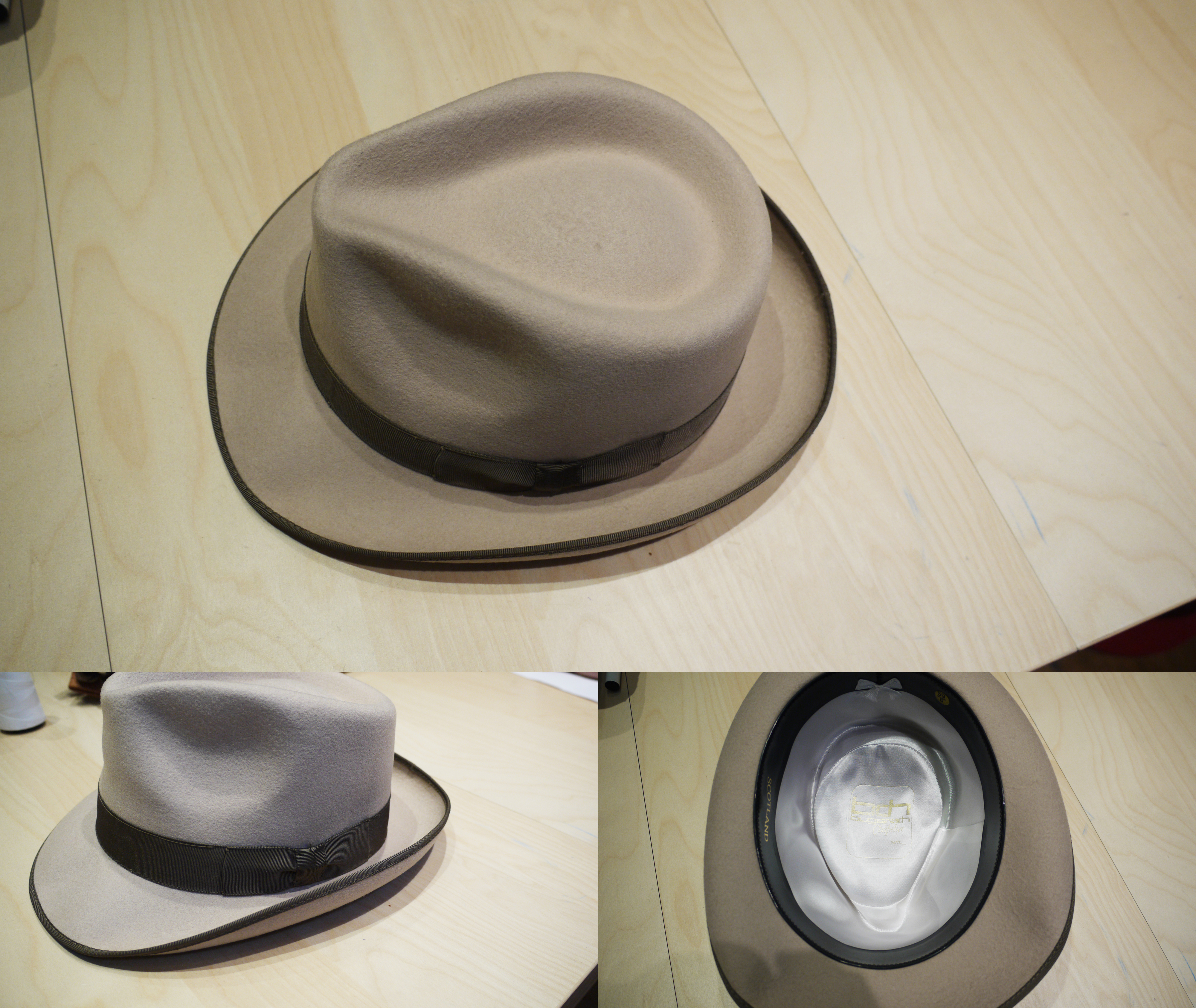 Il en ressort une galette de feutre légèrement en cloche, qui est alors passée dans une machine où elle est frappée par de multiples petits maillets qui en réduisent l’épaisseur et densifient les fibres. Puis le rond de feutre est teint, ce qui le fait rétrécir. Intervient alors l’étape de la stabilisation, après une dernière compression et cuisson à la vapeur. Le feutre est alors poncé, ce qui d’après Borsalino, est la marque distinctive de leurs chapeaux. Les chapeliers utilisent pour cela de la toile émeri et surtout, secret maison ancestral, de la peau de requin roussette. Donc du galuchat. Voilà un traitement de rêve qui justifie le prix. La surface du feutre, douce, est alors parfaite. Le chapeau est moulé sur sa forme, il ne reste plus qu’à appliquer les ganses autour et la doublure intérieure, à l’aide de colle, d’agrafes ou de la machine à coudre.