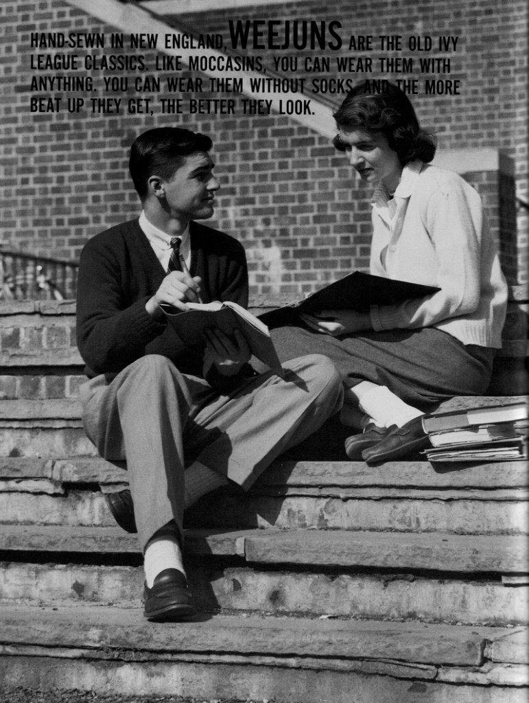 Le vrai basculement visuel qui donne à la chaussette blanche avec des bandes colorées son heure de gloire viendrait des USA. L’institution du Smithsonian raconte comment la chaussette-tube (sans talon anatomique, taille unique) devient un symbole de jeunesse américaine dans les années 1960–1970. Cette mode que l’on qualifie de preppy maintenant incorpore à l’envie ces chaussettes blanches avec des bordures élastiques colorées au sommet. Chaussettes acceptées dans ces années là pour porter avec des mocassins type penny-loafer. La tarte à la crème du look Ivy League. Ces chaussettes sont décrites à l’époque comme « mostly white, with some sporting colored stripes at the top ». Ces bandes colorées sont à la fois une signature esthétique sportive, c’est clairement dit, un rappel des couleurs d’une équipe (supporters, high-school teams, etc…) Dans les années 60 américaines, elle devient une chaussette de ville en fait, basculement intéressant. Comme de nos jours, tous les vêtements outdoor pour faire de la randonnée deviennent des habits du quotidien : voyez Arc’teryx, Columbia, North Face, etc…