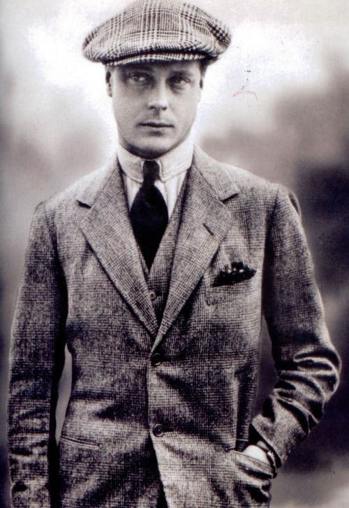 Il fut popularisé dans les années 1920, il y a un siècle donc, par le Prince de Galles d’alors, David d’un de ses prénoms, fils de George V. C’est lui qui abdiqua rapidement pour suivre son grand amour, l’américaine Wallis Simpson. C’est aussi lui qui avait quelques sympathies nazies. Bref, quoiqu’il en soit, dans ses jeunes années, ce fringant jeune homme toujours à la pointe du style aimait faire de l’effet par ses vêtements. Certains diront qu’il avait un goût très sûr, d’autres qu’il savait être grotesque. Quoiqu’il en soit, il mit ce tissu écossais sur le devant de la scène, et en particulier aux États-Unis d’Amérique, ce motif fit florès. Ci-dessous, le Prince de Galles porte costume et casquette en prince-de-galles. J’imagine que l’attrait venait de l’aspect ambivalent de l’étoffe, faite pour la campagne écossaise, et portée à la ville. Une sorte de dissidence vestimentaire comme d’autres font aujourd’hui. Mais il l’avait bien trouvé quelque part ce tissu ?