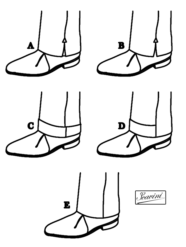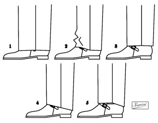 Ainsi, j’ai tenté des associations à ce sujet. J’ai dessiné un pantalon et je propose les couleurs de cuirs qui iraient avec. Cette proposition vaut pour un pantalon seul et pour un costume aussi. Dans un premier temps, avec un pantalon anthracite, le soulier noir va bien. Je ne l’ai pas dessiné mais un soulier en veau-velours foncé est aussi idéal. Avec un pantalon marine, le noir va (si vous portez le costume) et le marron va (si vous portez le costume ou le pantalon seul). L’accord de marine et de marron est difficile aux yeux des anglais. L’accord de marine avec du noir est difficile aux yeux de nombre de mes clients mais pas des anglais. Choisissez votre camp !